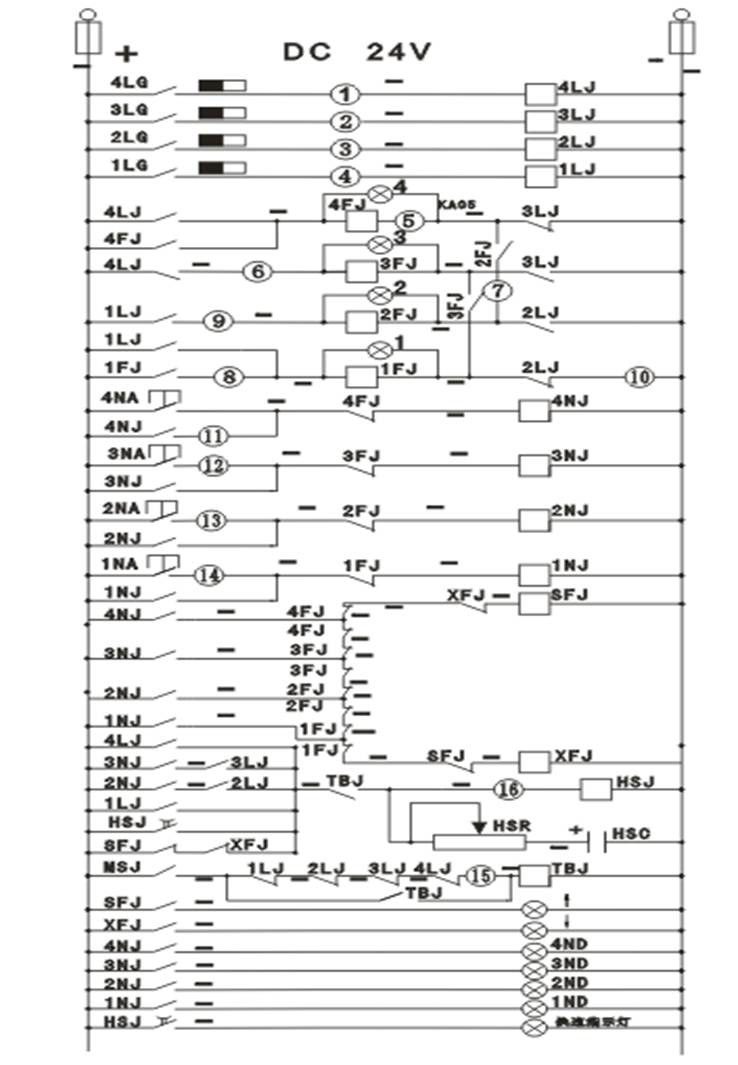 在電梯井道內(nèi),每層都裝有一只永磁感應(yīng)器,而在轎廂側(cè)裝有一塊長條的隔磁鐵板。假如電梯從1層向上運(yùn)行,則隔磁鐵板依次插入感應(yīng)器,當(dāng)隔磁板插入感應(yīng)器時(shí),該感應(yīng)器內(nèi)的干簧觸點(diǎn)閉合,控制相應(yīng)的樓層繼電器1LJ~4LJ吸合。