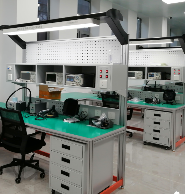 實訓桌結構:實驗桌規(guī)格為1600(長)*750(寬)*800(高),實驗桌主體結構全部采用高性能表面氧化的鋁型材及一次成型鋁壓鑄框架連接構件,連接構件采用壓鑄成型工藝(非焊接工藝),經機加工、拋丸、噴砂,表面靜電噴涂工藝,安裝方便、快捷,用戶可自行DIY組裝。桌體立柱采用工業(yè)鋁型材成型工藝,表面氧化處理,截面尺寸:70mm×70mm,四面帶槽,槽寬約8mm,端部配套塑料堵頭。桌面采用25mm實芯理化板,桌面板下設支撐框架,承受力不少于300kg。配備儲存柜,存放元件及工具,儲存柜底部4只高強度萬向可制動PU腳輪,方便移動。實訓裝置整體簡約不簡單,高端大氣,符合現代化產品審美和發(fā)展趨勢。