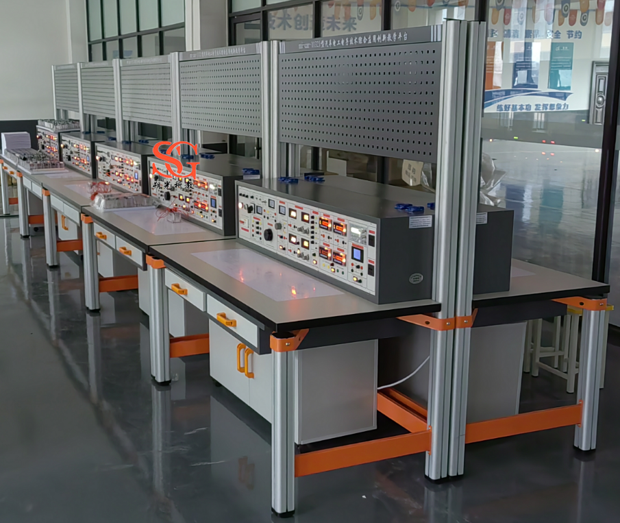 裝置由實(shí)驗(yàn)主機(jī)箱、儀器架、實(shí)訓(xùn)桌、移動矮柜、實(shí)訓(xùn)套件、學(xué)生凳等組成。實(shí)驗(yàn)裝置支架與實(shí)驗(yàn)桌可組合、可拆裝。支架與桌腳一體,鋁合金結(jié)構(gòu)。