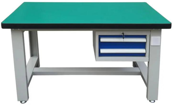 35、臺面:采用50mm厚高壓復合成型纖維板,表面覆蓋2mm綠色防靜電膠皮,四邊并以5mm ,PVC截面封邊,臺面具有耐磨、耐熱、耐污及易清潔等特點。具有耐沖擊、耐酸堿、吸震、防靜電的功能 |