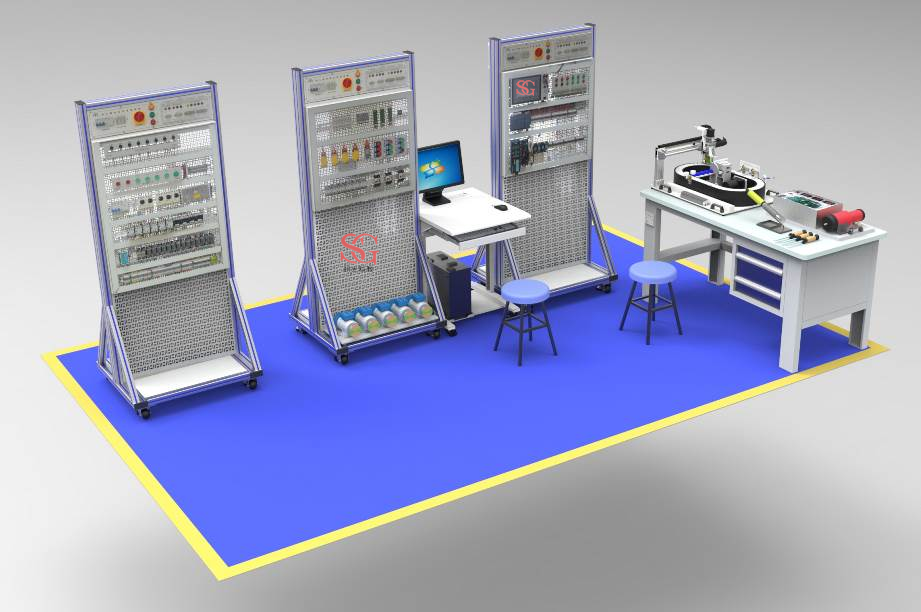 2. 平臺(tái)采用立式結(jié)構(gòu)開(kāi)放式設(shè)計(jì),主體采用40*80型材做骨架,周邊采用Q235冷扎鋼板做封板,表面靜電噴塑處理,整機(jī)既堅(jiān)固耐用,又美觀大方。底部裝有帶腳墊萬(wàn)向輪,萬(wàn)向輪移動(dòng)時(shí)用,可調(diào)腳固定時(shí)用,移動(dòng)固定兩相宜。頂部安裝電源模塊,中部為實(shí)訓(xùn)區(qū)域,依據(jù)任務(wù)安裝不同掛板。