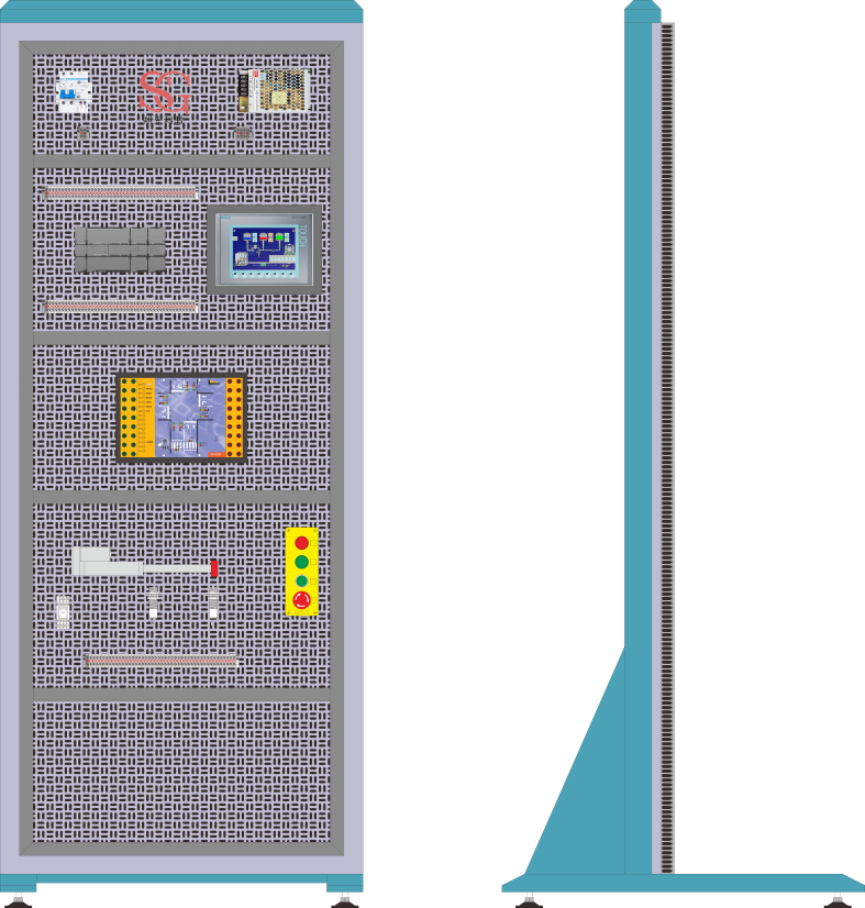 4)PLC模擬控制對象:,三層電梯、自動售貨機、機械手、自動門、天塔之光、全自動洗衣機、自動成型機、紅綠燈、裝配流水線、四路搶答器、音樂噴泉、軋鋼機、郵件分揀、物料分揀、多級傳輸帶等模擬控制實訓,指示燈采用貼片雙色LED,面板采用3D立體彩色搭配設計,使模擬對象更直觀立體,開關采用自復位兼自鎖一體設計使實訓能靈活實用,為適用各類PLC模塊具有輸入信號高低電平切換功能。