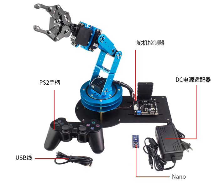 主要包括機械臂整體框架、DC電源適配器、舵機控制器、PS2手柄以及USB線等。整體機械臂采用鋁合金支架結(jié)構(gòu),支持6路PWM舵機接口,包括正逆運動學(xué)分析,支持防燒防堵轉(zhuǎn)功能,會自動斷電停止工作啟動自我保護機制,大大提高機械臂的壽命?赏ㄟ^上位機對6個不同軸的舵機分時控制。
