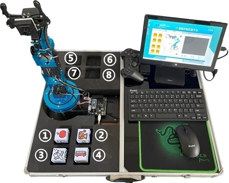 Ai智能控制平臺是基于6自由度的機器手臂作為教學(xué)平臺完成實驗功能,機械臂包含6個數(shù)字舵機,可以至少通過支持PS2手柄、PC上位機、語音識別、圖像識別等方式完成對機械手臂的抓取及相關(guān)操作,利用AI技術(shù)賦能將傳統(tǒng)的機械手臂智能化,完成物件識別、抓舉、庫存位置倉儲分揀(不少于8個庫位)功能。