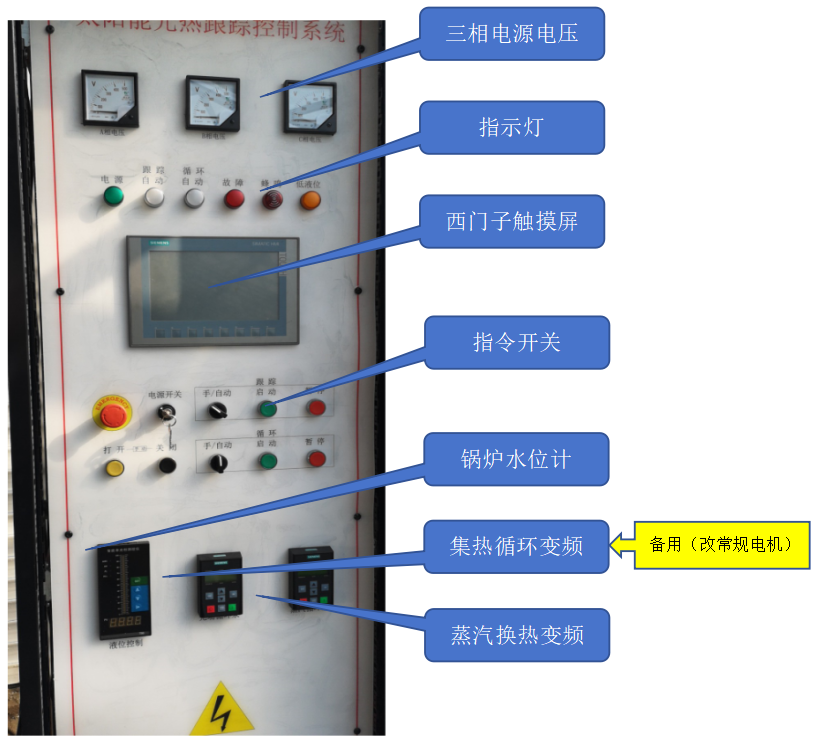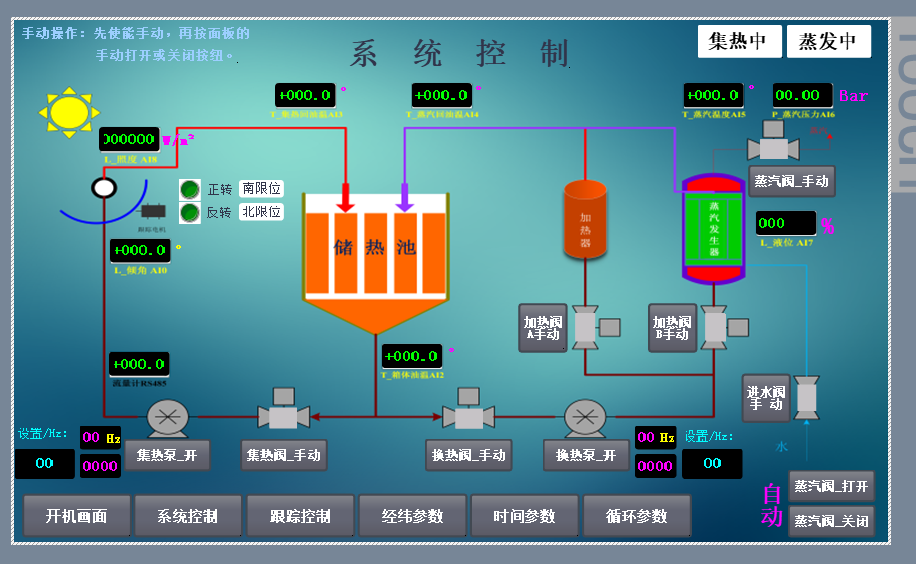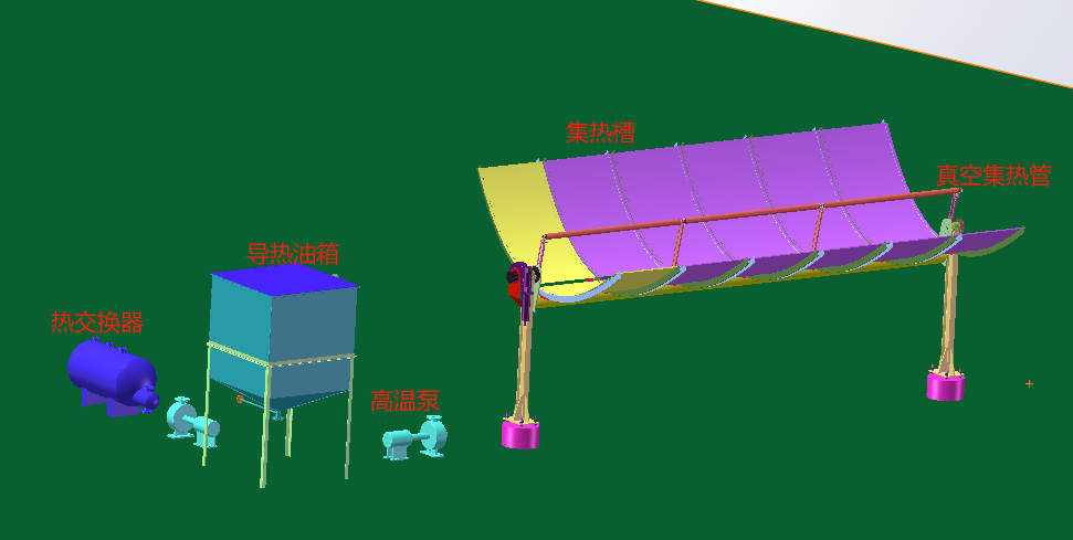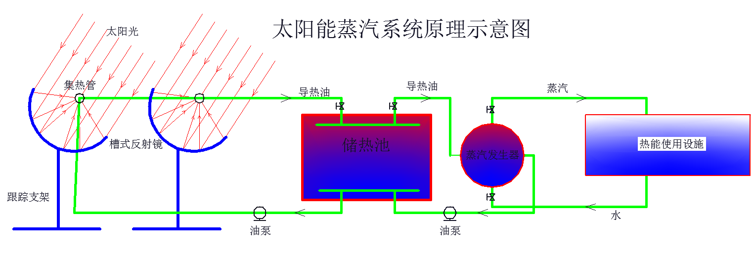太陽能光熱蒸汽系統(tǒng)原理如圖所示。太陽光經過槽式反射鏡(由跟蹤器跟蹤太陽光)匯聚到集熱管上,加熱集熱管內的導熱油,導熱油將熱能傳遞給儲熱池中的儲熱模塊,需要產生蒸汽或熱水時,由導熱油將儲熱模塊中的熱能傳遞到蒸汽發(fā)生器或熱交換器,產生蒸汽供給熱能使用設備使用。系統(tǒng)的綜合效率77%左右,按每平米800瓦(實際最高1000瓦)的直射太陽光能量計算,每平米集熱器功率為615瓦。日照時間6小時,產生1噸蒸汽需要220平米。此教學系統(tǒng)設計開口3m,長6米,共18㎡。一天約產生0.1噸蒸汽或800kg85℃熱水。