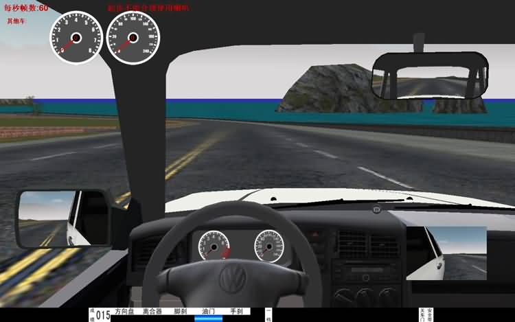 5、界面顯示:檔位顯示,訓(xùn)練成績(jī),后視鏡(左、右、中)、逼真汽車儀表(車速、里程、發(fā)動(dòng)機(jī)轉(zhuǎn)速)、場(chǎng)景地圖。在訓(xùn)練過程