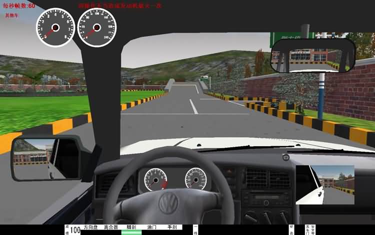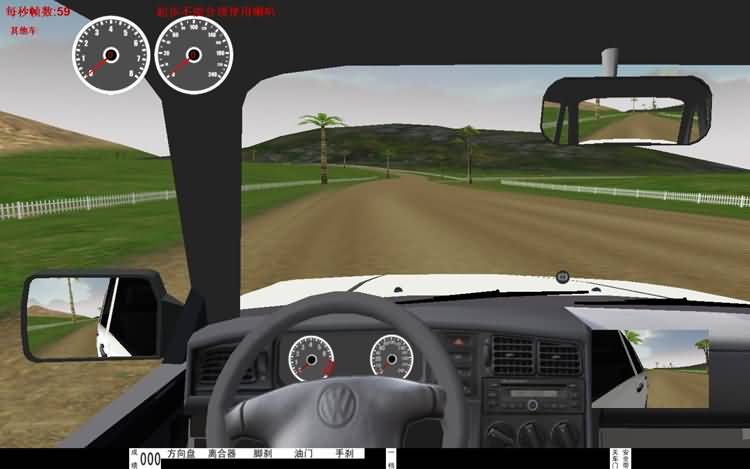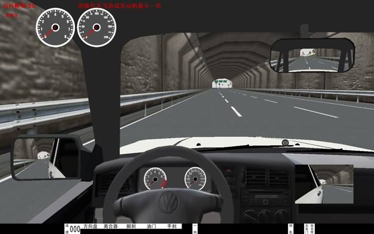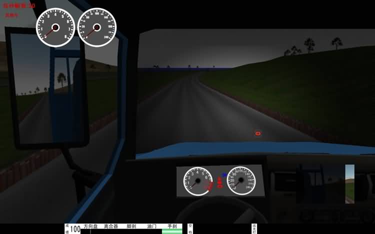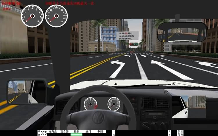 ※界面儀表盤上顯示有:車速表、發(fā)動(dòng)機(jī)轉(zhuǎn)速表、大燈、(遠(yuǎn)光燈、近光燈、視寬燈)、轉(zhuǎn)向燈、安全帶提示燈、車門關(guān)閉提示燈、警告燈及機(jī)油電瓶燈等,與硬件配合,錯(cuò)誤操作進(jìn)行扣分并具有語音提示。