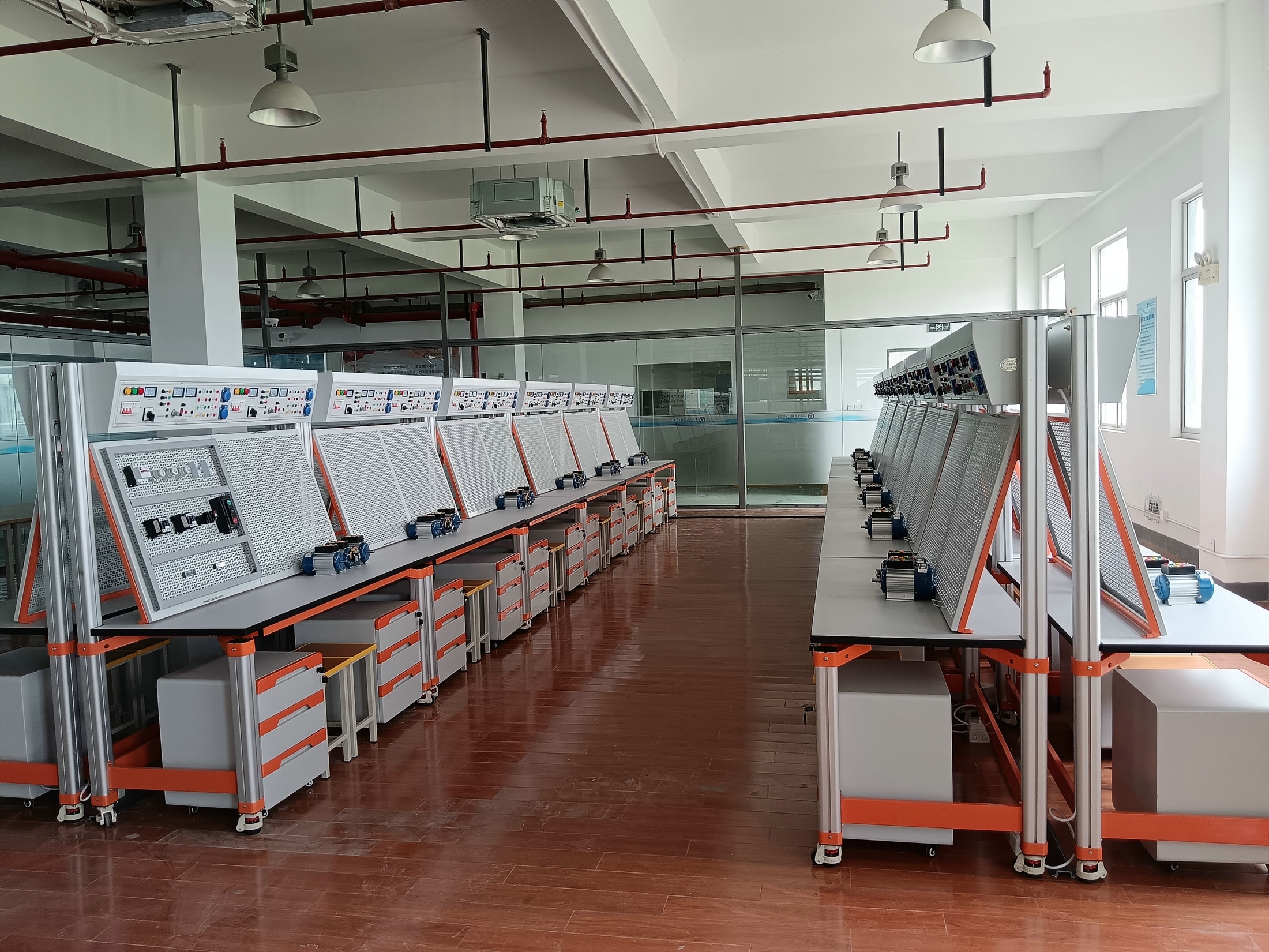 本實訓臺由實訓屏(內(nèi)置電源)、實訓桌、實訓儲物柜三大部分組成。