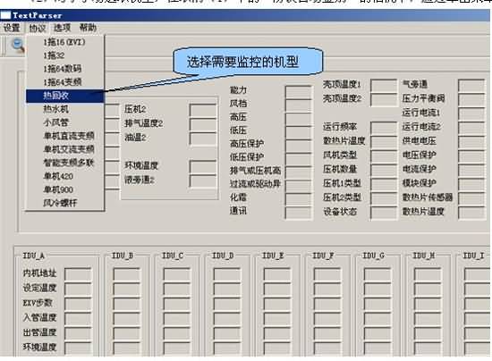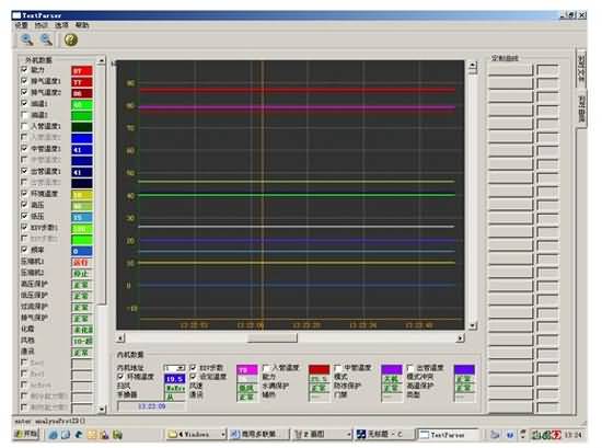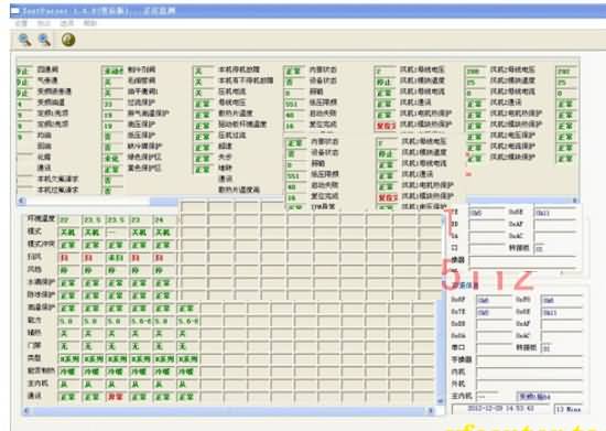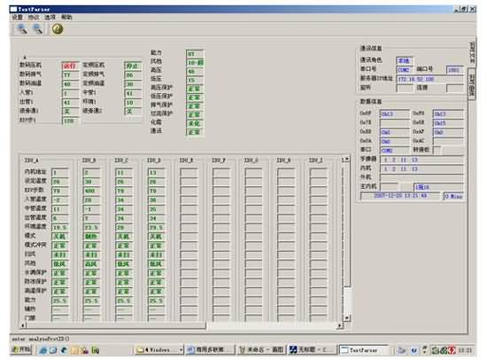 中央空調(diào)機(jī)由于工程復(fù)雜,設(shè)備分散,有的已經(jīng)裝修在開(kāi)花板上測(cè)試程序,一但出現(xiàn)了故障,工程量相當(dāng)大,為了能夠快速準(zhǔn)確地測(cè)出故障是由主機(jī)機(jī)組還是室內(nèi)機(jī)的故障的,每個(gè)生產(chǎn)廠家根據(jù)生產(chǎn)的和維修的需要而開(kāi)發(fā)了中央空調(diào)測(cè)試程序。可測(cè)試壓縮機(jī)的運(yùn)轉(zhuǎn)頻率,傳感器的各種數(shù)據(jù),電子膨脹閥的工作步數(shù)等幾十種中央空調(diào)的工作數(shù)據(jù)和狀態(tài),軟件可實(shí)現(xiàn)對(duì)內(nèi)機(jī)的控制,,可以對(duì)1-64臺(tái)內(nèi)機(jī)的狀態(tài)進(jìn)行設(shè)定。是高校提供了好的研究的學(xué)習(xí)設(shè)備。