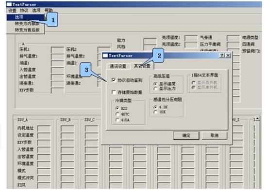 在該文本顯示界面的左側(cè),以文本的形式實(shí)時(shí)顯示當(dāng)前機(jī)組的運(yùn)行數(shù)據(jù)。在界面右側(cè)的上半部分,是對(duì)通訊信息的顯示,包括通訊角色及通訊端口的設(shè)定值以及對(duì)當(dāng)前通訊狀態(tài)的顯示。在界面右側(cè)的下半部分"數(shù)據(jù)信息"中,顯示當(dāng)前接收到哪種數(shù)據(jù)幀、接收到的數(shù)據(jù)幀的地址、當(dāng)前在線的手操器、內(nèi)機(jī)、外機(jī)地址以及當(dāng)前時(shí)間等信息。