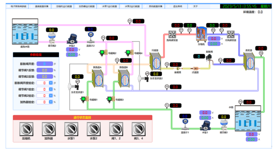*14、50寸高精度觸摸屏一體機及控制開發(fā)軟件,可進行教學演示和實驗模式控制,并實時顯示系統(tǒng)溫度、壓力、差壓、流量、功率等數(shù)據(jù),計算系統(tǒng)能效比和制熱量等參數(shù)。