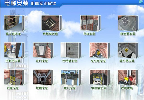 安裝廳門懸掛支架→廳門懸掛裝置安裝→廳門懸掛裝置與門套安裝→調整廳門懸掛裝置,本項目單元從“物料場”及“工具庫”中選取當用物料及工具進行廳門懸掛組件安裝(且有模擬工具使用音效、快問快答及技術要求) |