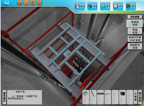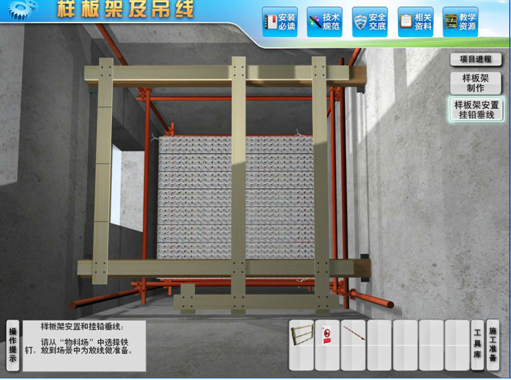 技術要求與工程圖紙→依據(jù)井道圖紙,從“工具庫”中選取當用工具進行導軌支架安裝位置確定(且有模擬工具使用音效) |