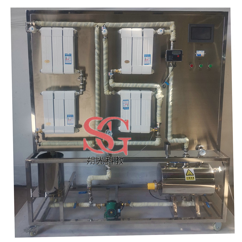 供熱計(jì)量小型模擬實(shí)驗(yàn)裝置包含了雙管水平并聯(lián)式上供下回和加跨躍管單管順流式二種不同的用戶布置方式,采用熱量計(jì)量表。系統(tǒng)配備電熱水鍋爐、供熱管道和散熱片,并設(shè)有膨脹水箱、循環(huán)水泵、自力式壓差控制閥、恒溫控制閥、自動(dòng)排氣閥、熱量表和等設(shè)備。