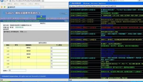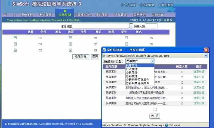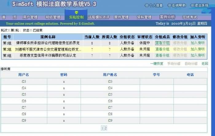實(shí)驗(yàn)控制:實(shí)驗(yàn)輪次(顯示每一小組做了幾次案件審理了)、實(shí)驗(yàn)狀態(tài)(表示每輪實(shí)驗(yàn)是未開始、開始、己結(jié)束)、分組管理(對(duì)全班學(xué)生進(jìn)行實(shí)驗(yàn)前分組,可以有手動(dòng)模式和自動(dòng)模式2種模式,并對(duì)分好的組分配案件讓學(xué)生進(jìn)行實(shí)驗(yàn)。當(dāng)手動(dòng)分組時(shí)可以指定哪幾位學(xué)生為一組,并為該組指定某一個(gè)案件來模擬,這樣在同一節(jié)實(shí)驗(yàn)課里,可以有若干指定小組模擬不同的案件進(jìn)行實(shí)驗(yàn)。當(dāng)自動(dòng)分組時(shí),系統(tǒng)將自動(dòng)為學(xué)生分組,并形成所有小組只能模擬老師指定的同一案件。若對(duì)分組不滿意可以應(yīng)用一鍵恢復(fù)實(shí)現(xiàn)重新分組,老師還可以任意進(jìn)入一個(gè)小組進(jìn)行旁聽、實(shí)驗(yàn)管理是對(duì)所管理的實(shí)驗(yàn)進(jìn)行控制(暫停、繼續(xù)、停止)