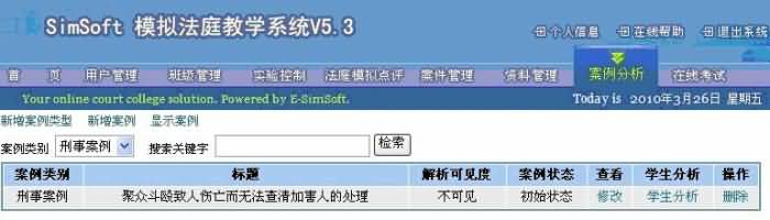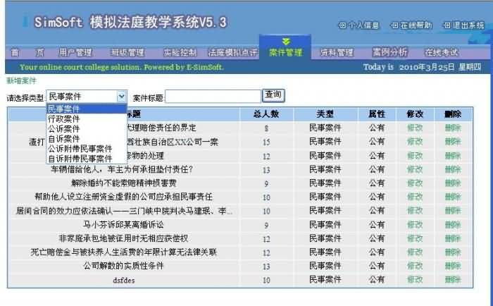 案件管理:老師可以新增,修改,刪除案件,案件供學(xué)生實(shí)驗(yàn)使用,分7大類型