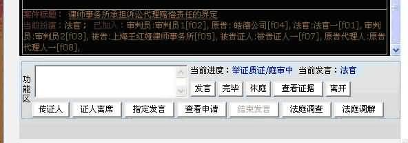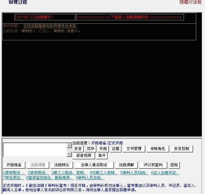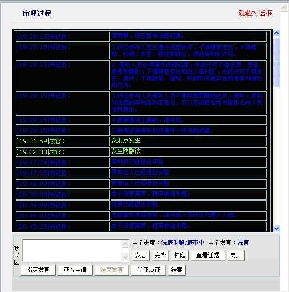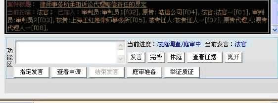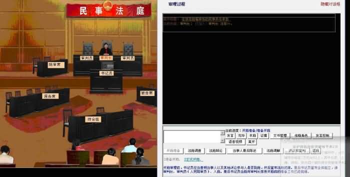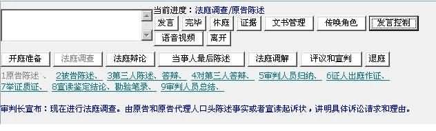 6.審理過程中將一直提醒當(dāng)前審理的進(jìn)度情況,和當(dāng)前發(fā)言者是誰以及前一階段和下一階段的控制功能,可以隨時(shí)查看所有的證據(jù)等等。