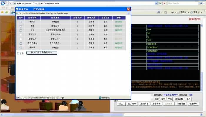 4.軟件擁有可以有效控制扮演人員進(jìn)出庭功能,如需要傳證人時(shí),證人才可以被允許進(jìn)入法庭現(xiàn)場(chǎng),否則則需等待傳喚. 證人角色只有在被法官傳喚進(jìn)如法庭后才可以看到發(fā)言記錄。