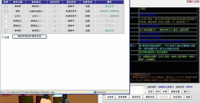 3.軟件中擁有指定發(fā)言功能和申請(qǐng)發(fā)言功能,有效控制并維持審理過程中的發(fā)言區(qū)的秩序, 審理過程中可以進(jìn)行休庭,和結(jié)束休庭,方便教學(xué)的連續(xù)性.上述功能由每一小組中扮演法官角色的人員來控制.