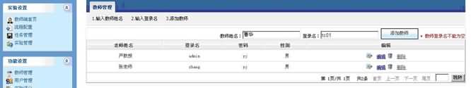 1. 進入管理員界面后,點擊“功能設(shè)置”中的教師管理,進入教師管理模塊,在右上方輸入框內(nèi)輸入老師的登錄名、姓名,并點擊右側(cè)“添加教師”,教師增加完成。