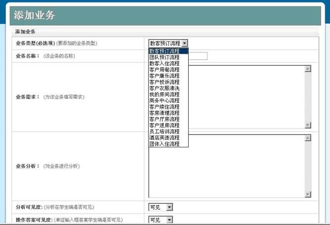 定此業(yè)務(wù)的流程,這里選擇的流程即為在流程配置中已經(jīng)設(shè)置好的流程,此處系統(tǒng)會自動讀入系統(tǒng)已經(jīng)設(shè)置好的實驗流程數(shù)據(jù),及此實驗流程可能用到的單證類型及單證類型的操作選項。并且需要指定業(yè)務(wù)的名稱,業(yè)務(wù)的需要(此業(yè)務(wù)需求為學生本次實驗中需要用到的案例及實驗中需要用到的相關(guān)數(shù)據(jù)。)如有需要,可以添加此業(yè)務(wù)的分析并可以選擇是否讓學生看到此出分析信息。