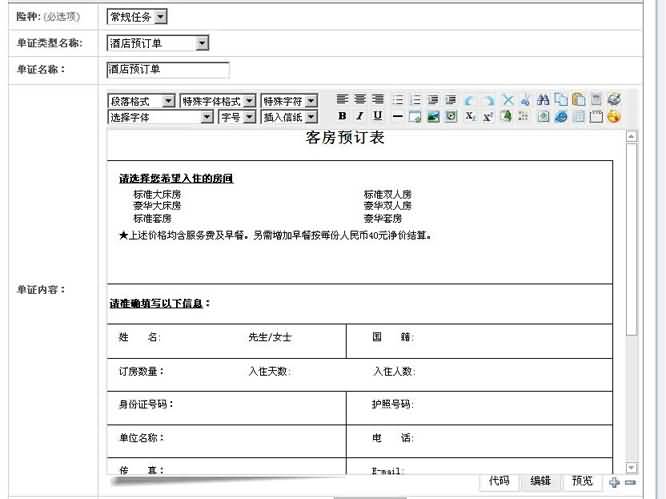 7. 在單證添加的界面中,需要選擇此單證的所屬業(yè)務(wù)、單證類型、名稱,并在下方的單證內(nèi)容編輯框中設(shè)計相關(guān)單證的內(nèi)容,然后點擊確定,完成單證模板編輯。如下圖所示: