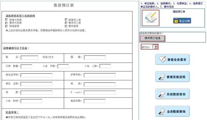 4. 出現(xiàn)單據(jù)內(nèi)容后,選擇此單據(jù)的操作選項,在右側(cè)相關(guān)單據(jù)下方,如此練習中選擇“填寫預(yù)定信息”按鈕,點擊此按鈕,則可以填寫相關(guān)單據(jù)。如在互動模式時候,可以在此按鈕下方選擇提交給哪個用戶。個人模式中此處默認為用戶自己。如圖所示: