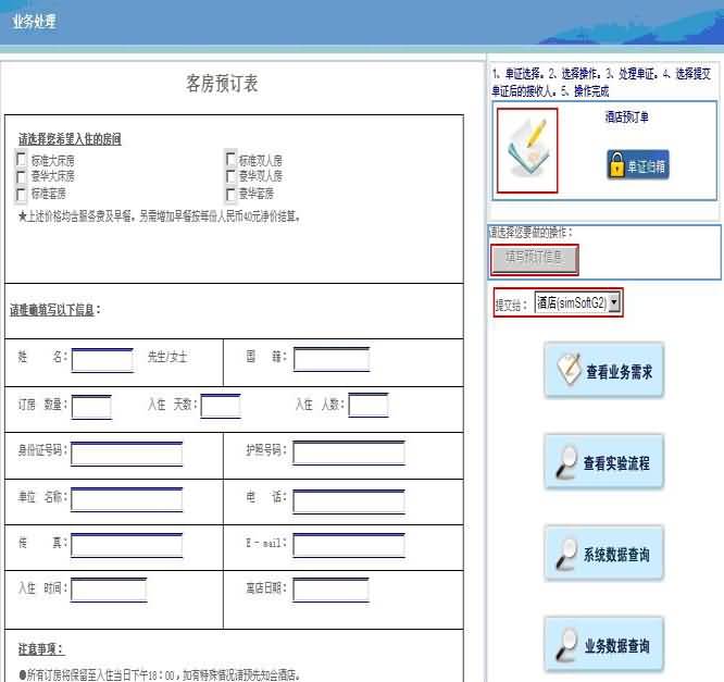 在選擇完操作部門后,正式進入業(yè)務(wù)練習界面,實驗練習界面分為如下圖所示:
