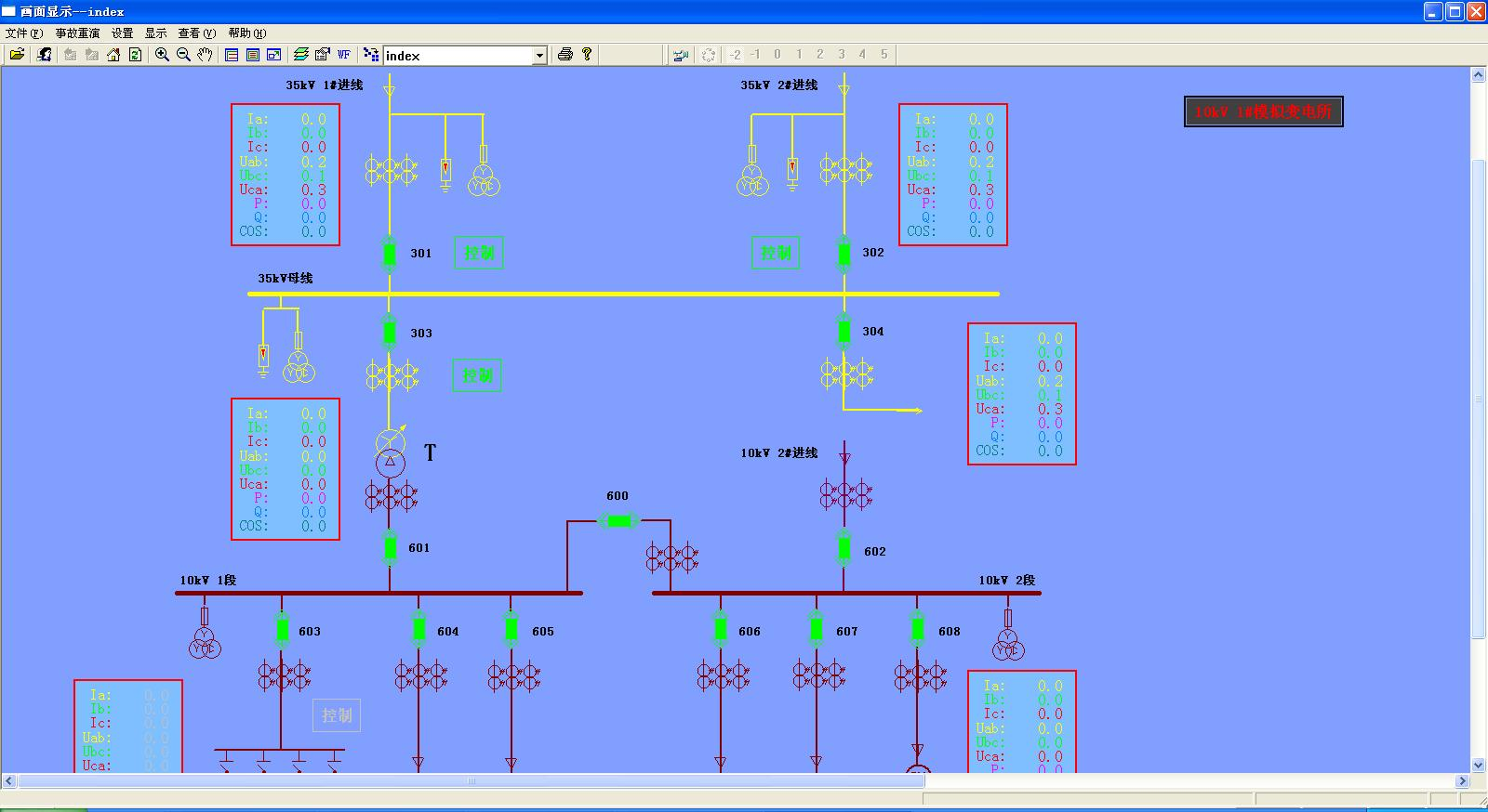 10. 上位機(jī)得監(jiān)控軟件,監(jiān)控主機(jī)與現(xiàn)場智能設(shè)備采用RS485總線,Modbus-RTU協(xié)議構(gòu)建底層監(jiān)控網(wǎng)絡(luò)。主要實(shí)現(xiàn)以下功能:1、對供配電一次系統(tǒng)進(jìn)行組態(tài),實(shí)時(shí)顯示主接線的變化;2、實(shí)時(shí)采集、顯示、存儲(chǔ)各類電量參數(shù);3、對采集的各種電量量可生成實(shí)時(shí)和歷史曲線和報(bào)表,以利于實(shí)驗(yàn)者比較、分析實(shí)驗(yàn)數(shù)據(jù);4、監(jiān)視各斷路器位置、保護(hù)動(dòng)作出口狀態(tài);能夠控制輸電線路斷路器的跳/合閘;5、根據(jù)采集的母線電量實(shí)現(xiàn)對電壓、無功的自動(dòng)調(diào)整。